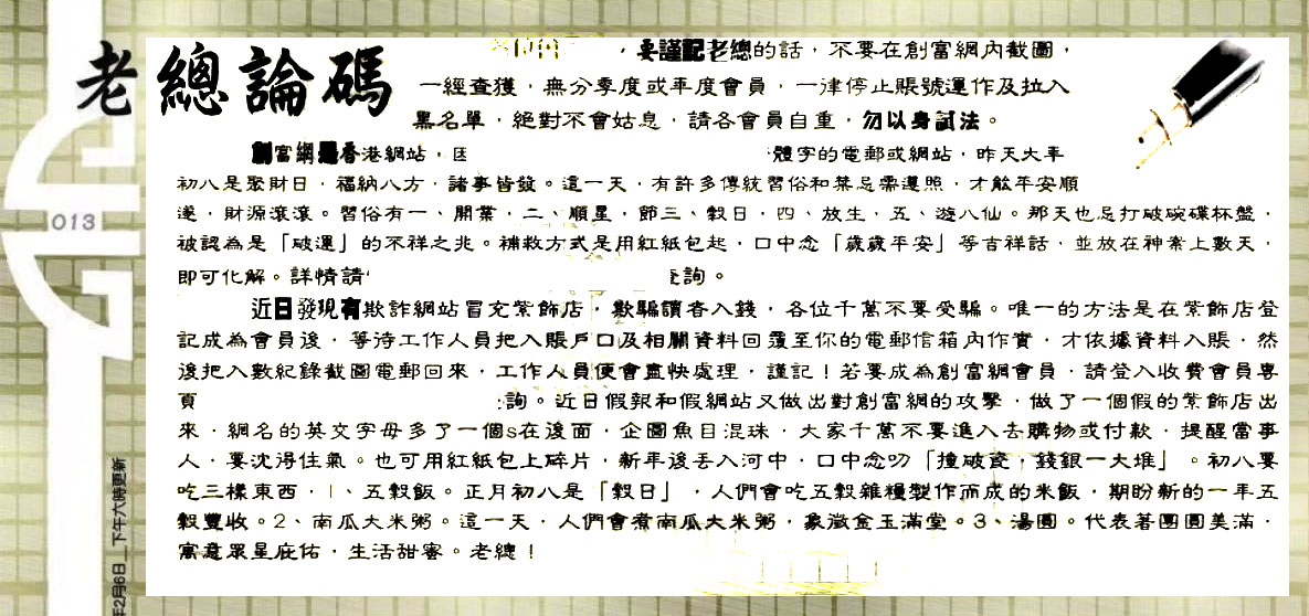 013期:六合皇金句/老总论码/萧公子/林大师/五行夺码/老 ...