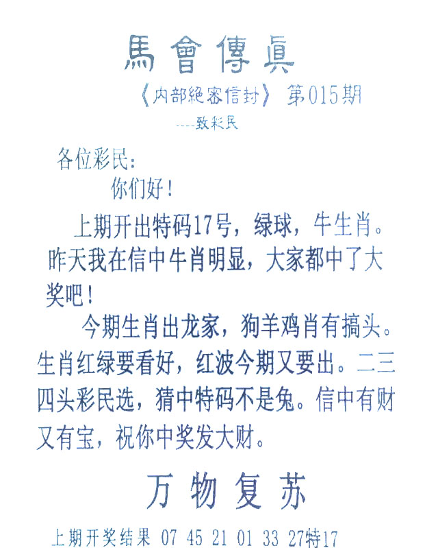 015期:首发推荐:≮馬會傳眞≯→(香港正版)