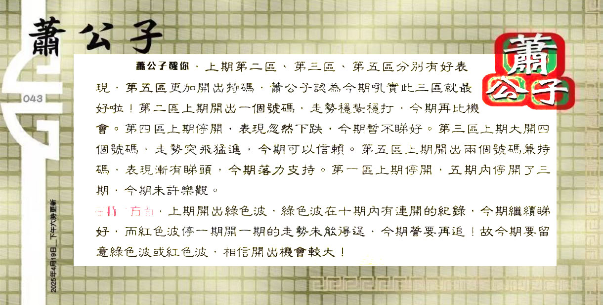 043期:六合皇金句/老总论码/萧公子/林大师/五行夺码/老 ...