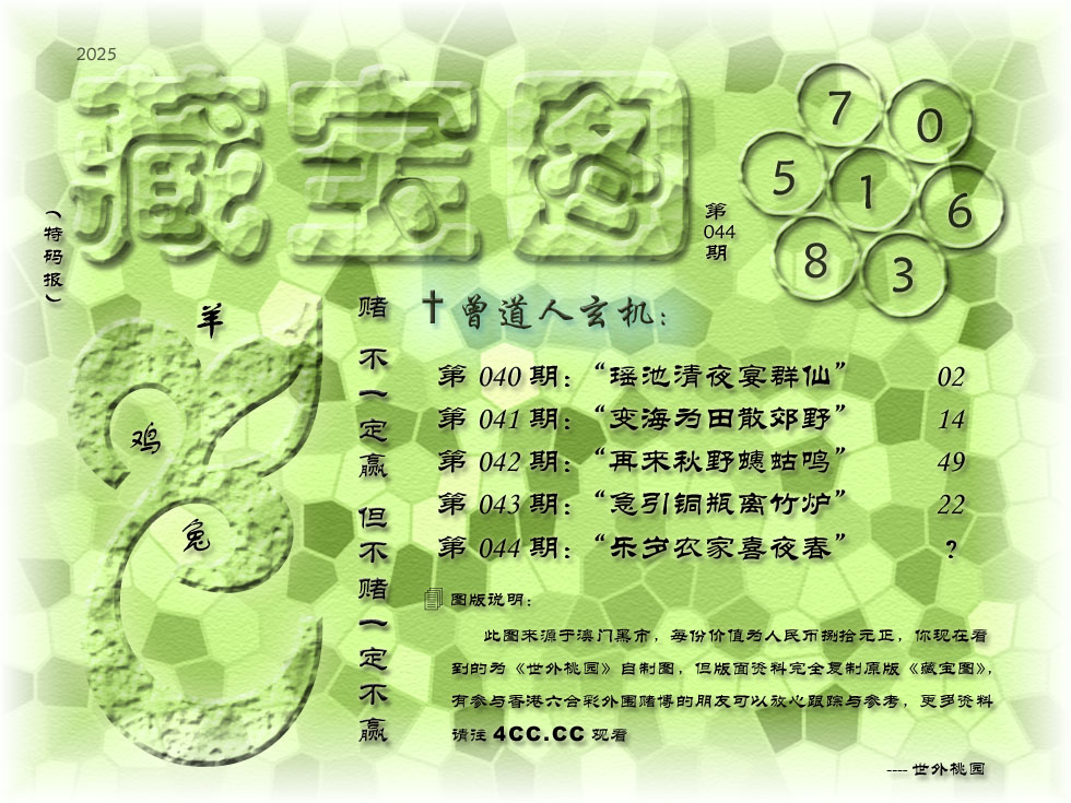 044期藏寶圖 新:乐岁农家喜夜春 老:树成多是人先老 禁: ...