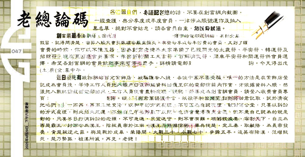 047期:六合皇金句/老总论码/萧公子/林大师/五行夺码/老总信箱截图