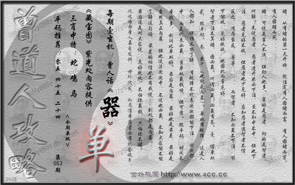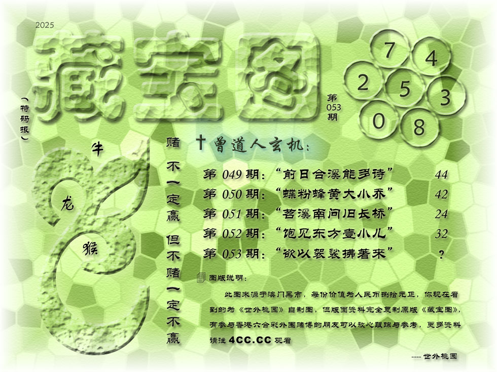 053期藏寶圖 新:欲以袈裟拂著来 老:犹恨东风无意思 禁:兔 禁:1尾 玄機字:《器》
